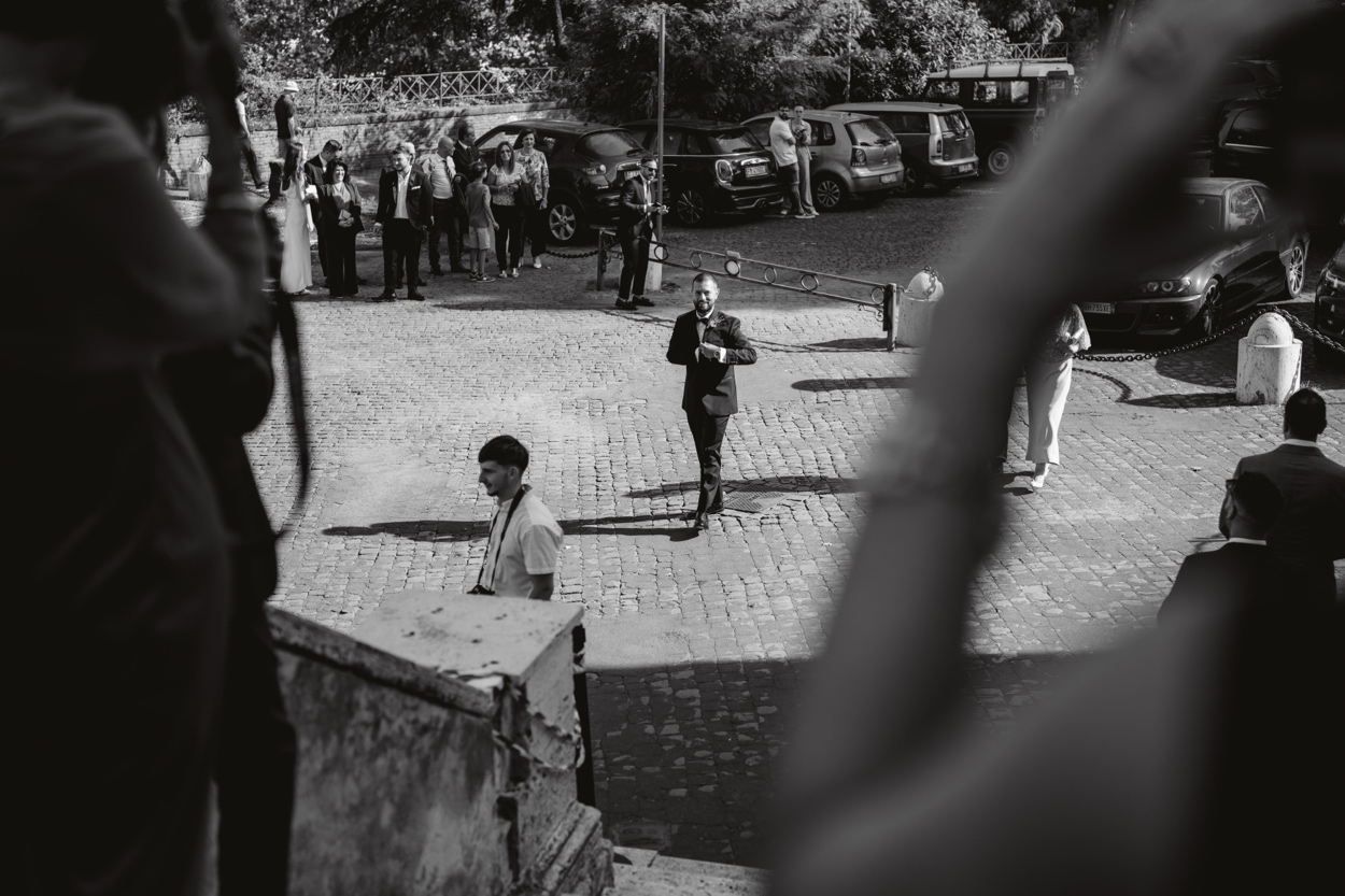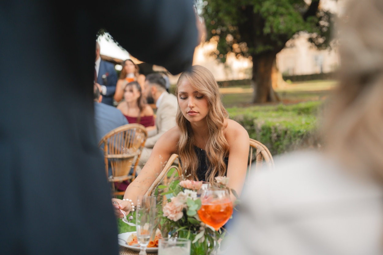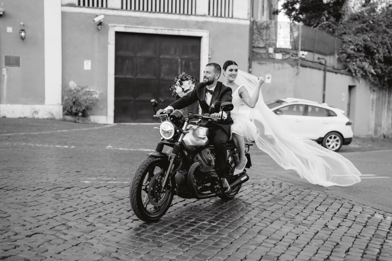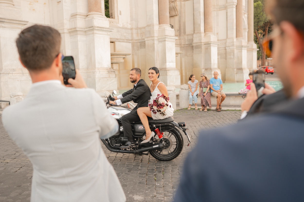 Ilaria e Alessandro hanno pronunciato le loro promesse circondati da amici e familiari, con il tramonto romano a dipingere il cielo di sfumature dorate.